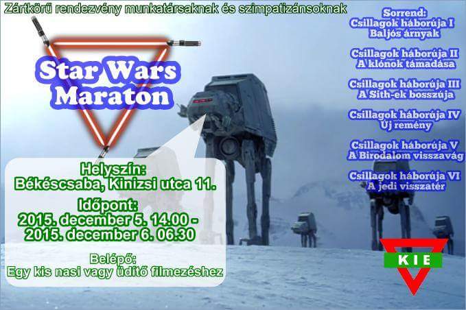 2015. december 5-én munkatársaknak és szimpatizánsoknak levetítjük a Csillagok Háborúja első 6 részét. A hetediket mindenki nézze meg majd moziban, de legalább frissek lesznek az előzmények...
