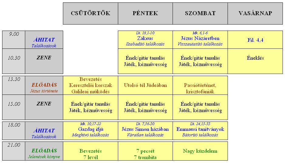 Szombaton Bakay Péter is érkezik: spirituálé kórus próba lesz délután, este az áhítat előtt, alatt, után bemutató. Énekel az Animato kórus is. Az esti áhítatot Péter tartja ezen a napon.